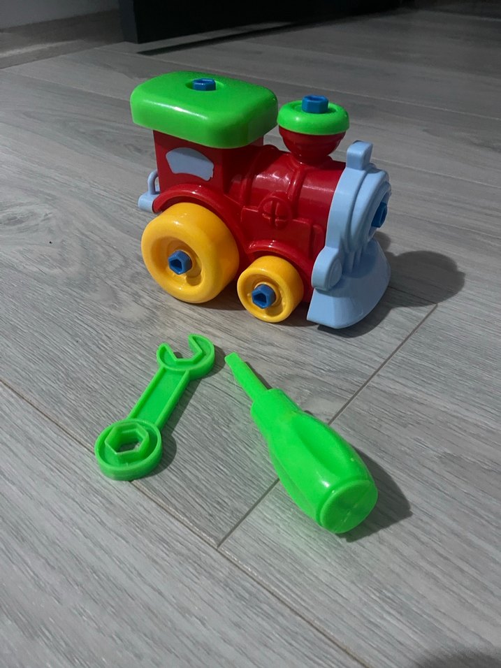 Çıkarılabilir parçalar ve tornavida ile birlikte renkli plastik oyuncak tren. Çok renkli ve dayanıklı malzemeden yapılmıştır.