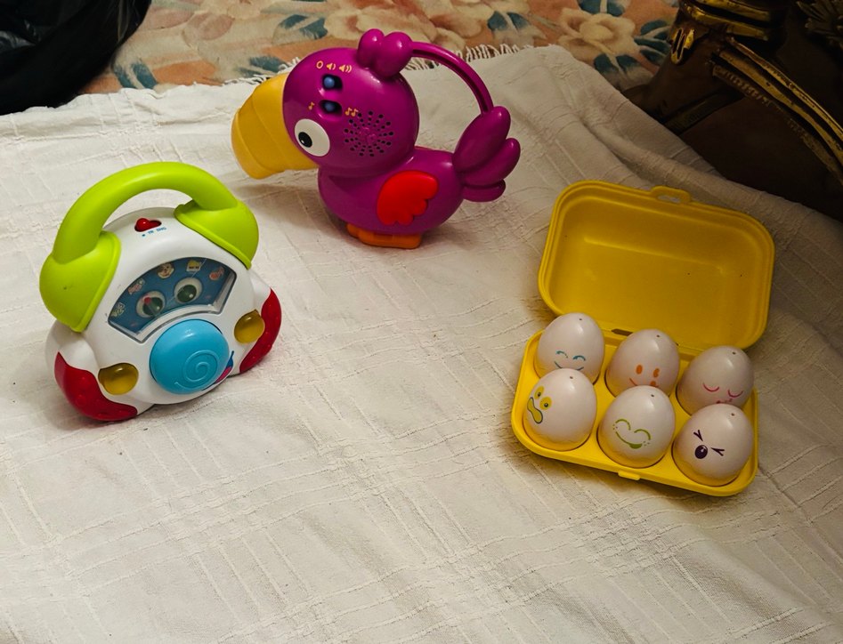 Bu set, ses düğmeli mor kuş ve gülen yumurtaların bulunduğu sarı yumurta kutusunu ve ingilizce dil eğitimini müzikle veren renkli çocuk oyuncakları sunar. Canlı ve eğlenceli tasarım oyun keyfini artırır. ÜÇÜNÜN FİYATIDIR