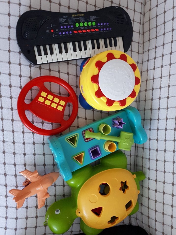 Mini klavye, direksiyon, davul, şekilli kutu, uçak ve kaplumbağa puzzle içeren renkli çocuk oyuncakları seti. klavye üst tuşlar çalışıyo.davul çalışıyo ama temassızlık var tamir olur mu bilmiyorum