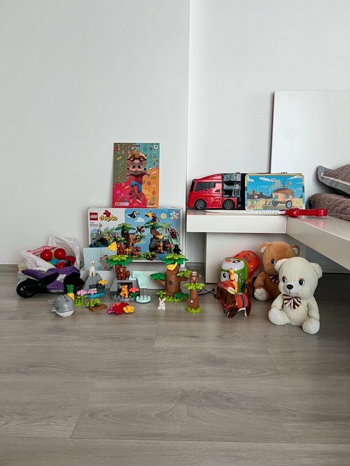 Peluş ayılar, yapı blokları, oyuncak araçlar ve çeşitli küçük figürlerden oluşan renkli çocuk oyuncaklar.hepsı sorunsuz yepyenı fotografta gorulen hersey gonderılecektır.dısardan gonderım olucak kargo bana ait degıldır