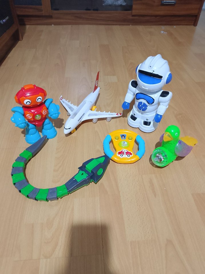 İki robot, oyuncak uçak, yeşil kuş, sarı direksiyon ve çok parçalı oyuncak yılandan oluşan renkli çocuk oyuncakları seti. hepsi pille çalışır durumda kırık çizik yok çalışırken video atabilirim