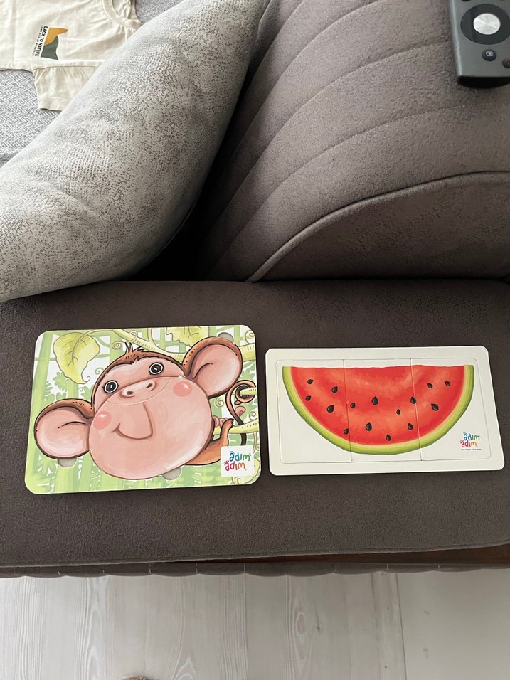 Renkli çocuk puzzle seti, maymun ve karpuz dilimi tasarımlı iki puzzle içerir.