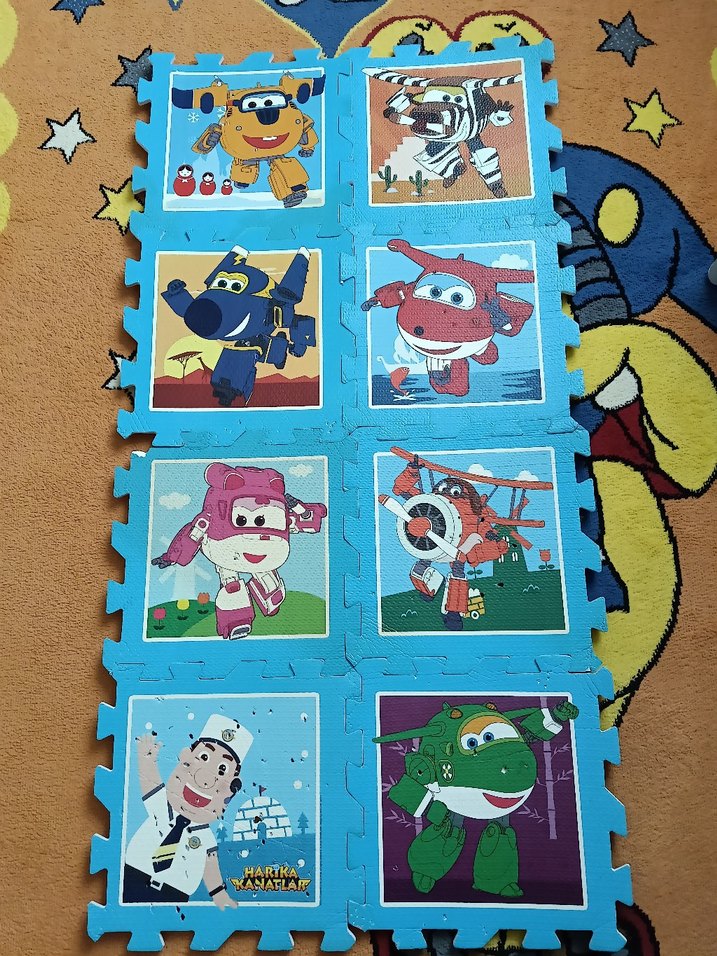 Renkli 8 parça çocuk puzzle seti, çizgi film karakterleriyle süslenmiş. Çocuklar için yumuşak ve kolay tutulan köpük parçalar.
