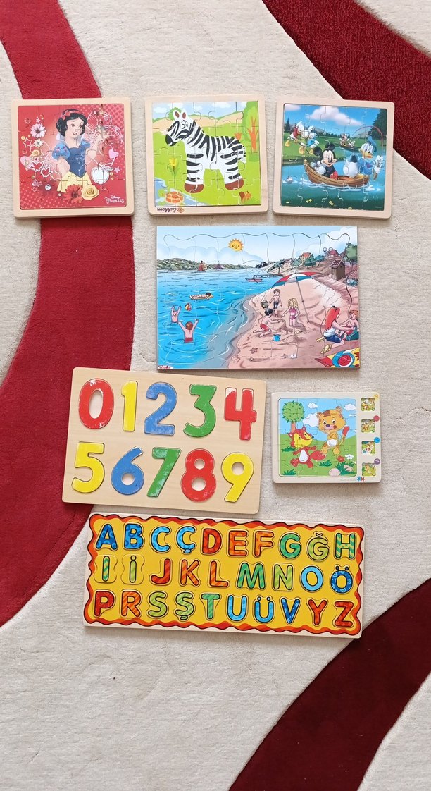 Renkli çocuk puzzle seti, 0-9 sayıları ve A-Z harflerini içeren ahşap puzzle'lar ile birlikte çeşitli eğlenceli ve renkli sahne puzzle'larından oluşur.