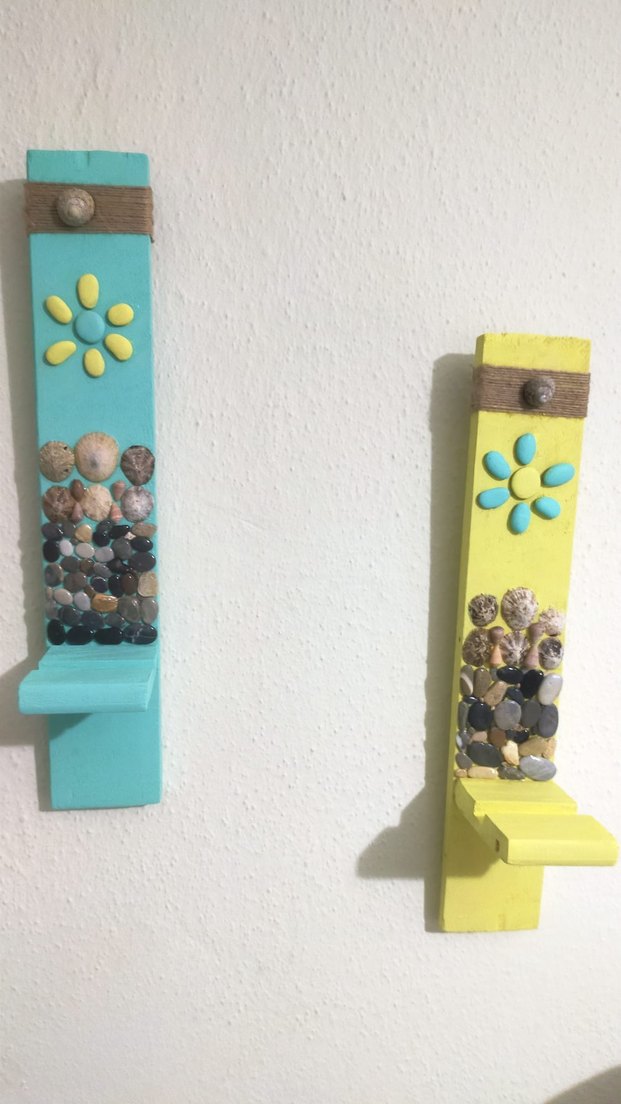 Turkuaz ve sarı renkli, taş ve çiçek desenli çocuk rafları. Çocuk eşyalarını düzenlemek için uygundur. Mumluk,saksılık,minik kitap icin kitaplık vs.olarakta kullanılabilir. İKİSİNİN birlikte fiyatıdır.