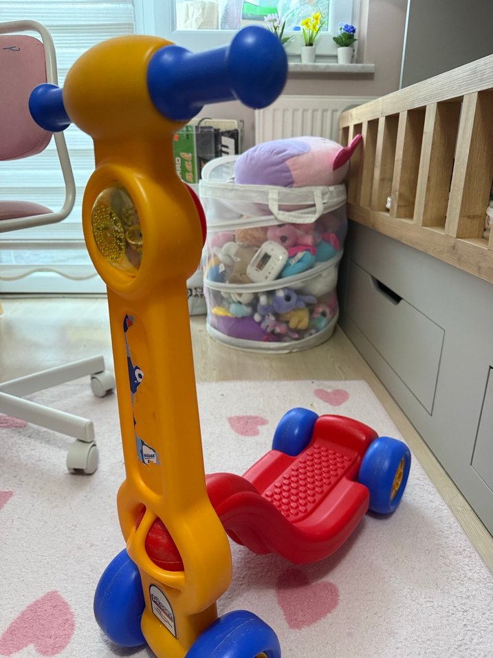 Dört mavi tekerlekli, tutması kolay saplı ve geniş ayaklıklı renkli çocuk scooter.ilk scooter. Pilsan.