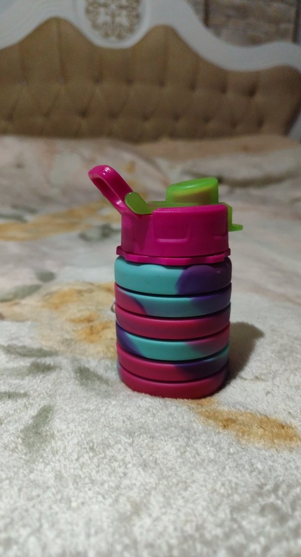 Canlı renklerde, çok renkli tasarıma sahip çocuk silikon su şişesi. Kolay içim için açılır kapaklıdır açılır buyur katlanır kuculur yer kaplamaz