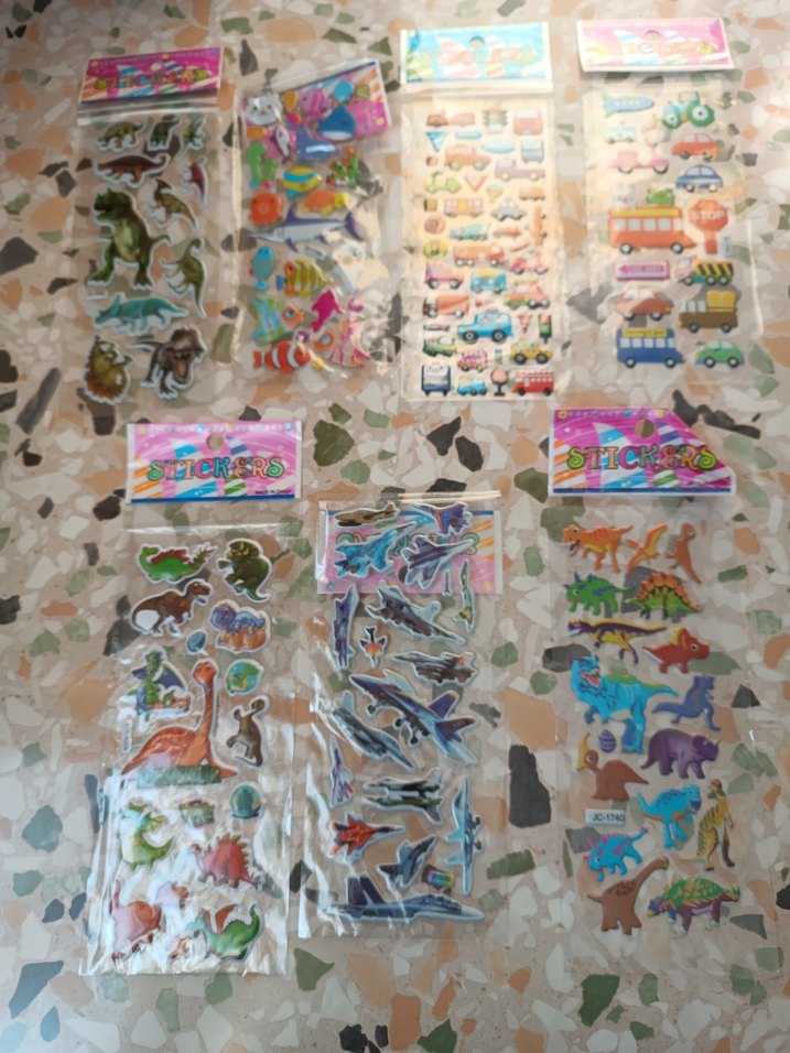 Dinozorlar, hayvanlar, araçlar ve deniz canlıları temalı renkli çocuk sticker setleri. Çocuklar için eğlenceli ve dekoratif.
