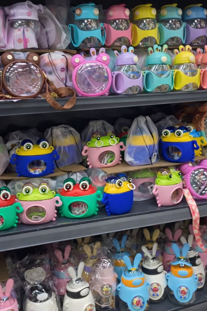 Çocuklar için çeşitli canlı renklerde ve hayvan figürlü suluk.