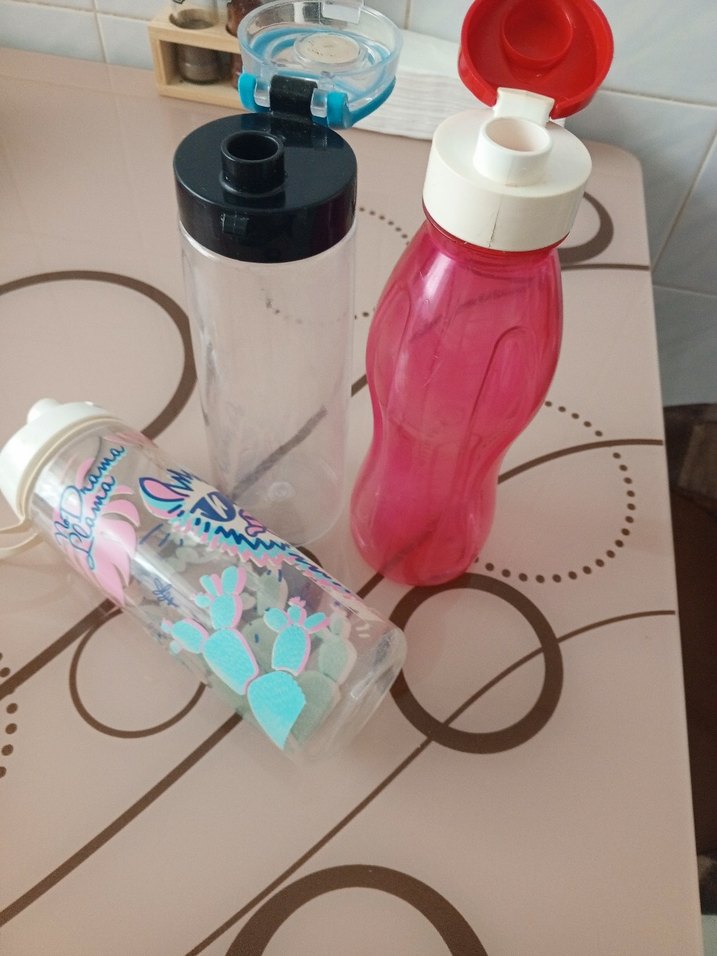 Üç renkli çocuk suluk seti, kolay açılır kapaklı, pembe ve şeffaf tasarımlı.3 tanesinin fiyatı beyaz üzeri nakışlı olanın üst kapagı yok kayboldu kırmızı ve diğeri beyaz olan sağlam