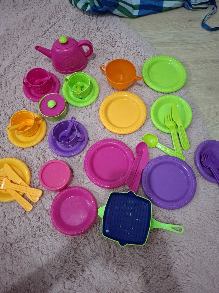 Çeşitli parlak renklerde tabak, çatal, bıçak, fincan ve çaydanlık içeren renkli çocuk seti. Dayanıklı plastikten yapılmıştır. ️37 parca sorun olanları resimlerde gösterdim diğerlerinde hiç bir sorunu yok toystan almistim temiz az kullanildi