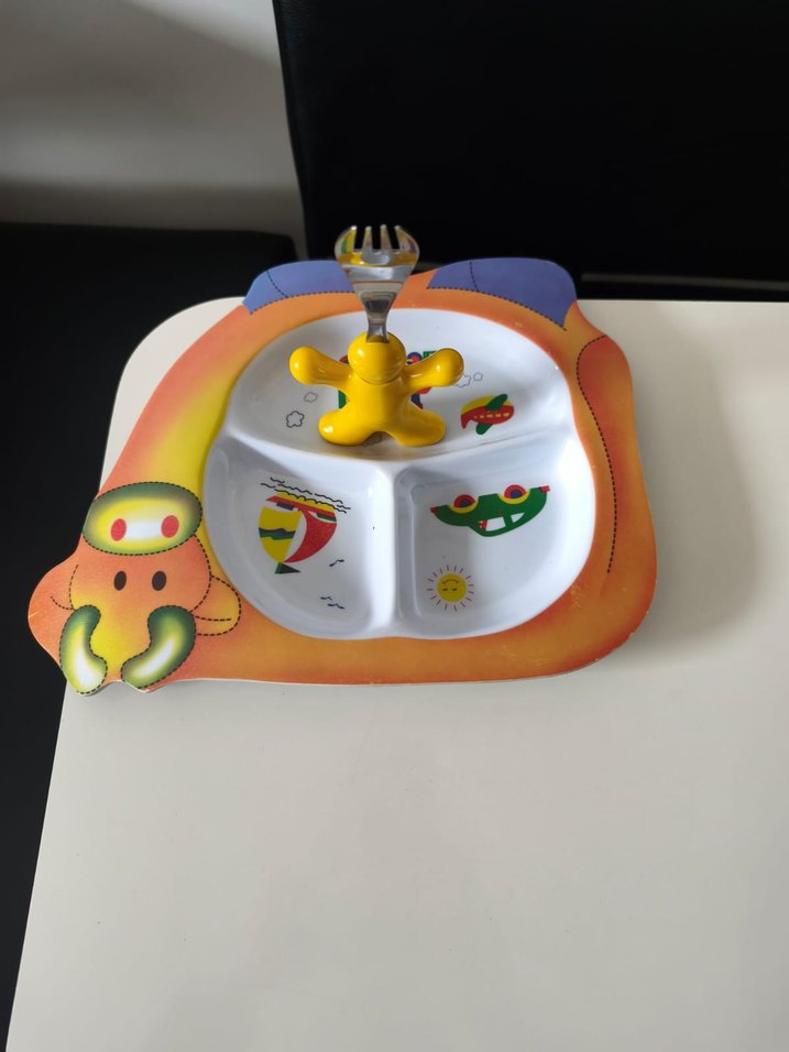 Bölmeli renkli çocuk tabağı ve ayıcık şeklinde sarı çatal tutucu. Tabağın üzerinde eğlenceli desenler bulunur. Çatal Stanley steel markadır