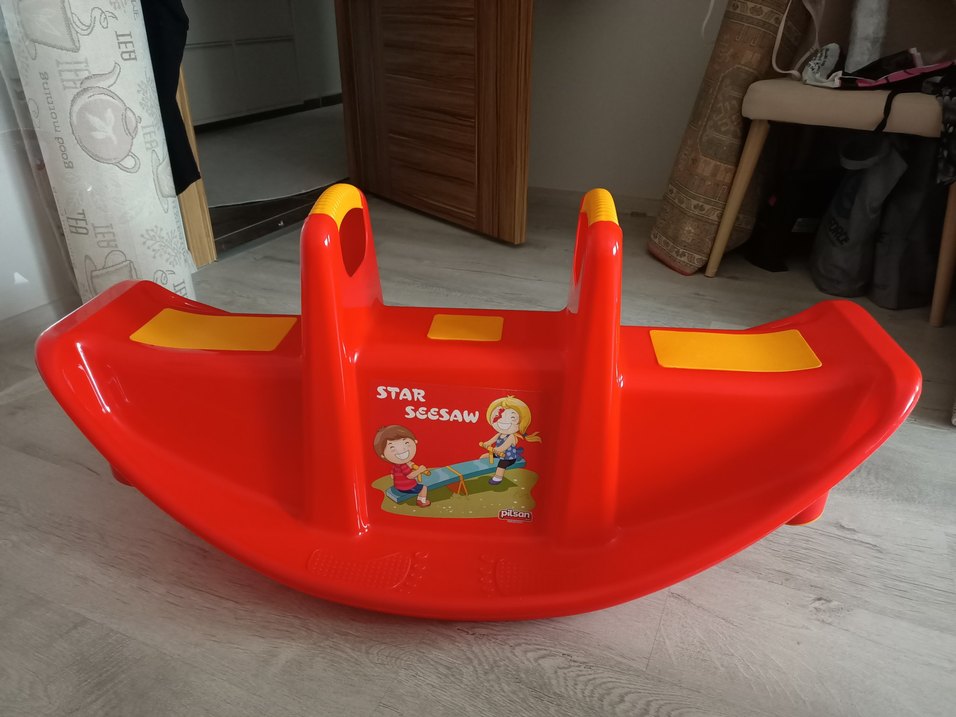 İki tutamağı olan, PİLSAN marka önünde 'STAR SEESAW' yazılı renkli ve sağlam kırmızı çocuk tahterevallisi. Denge oyunu için uygundur.