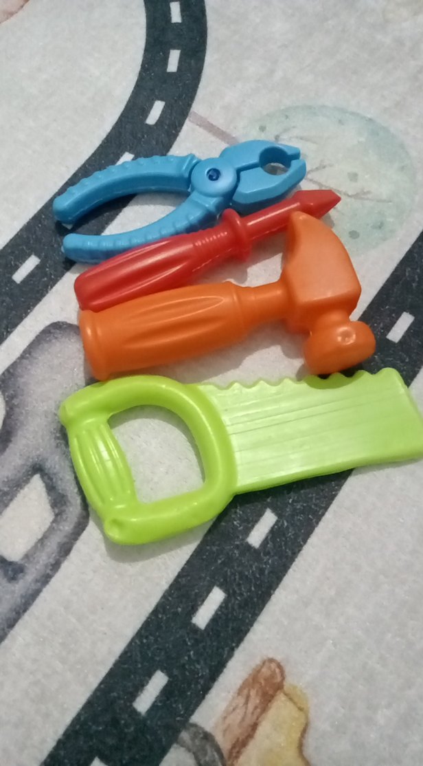 Hayal gücünü destekleyen oyuncak çekiç, testere, tornavida ve pense içeren renkli çocuk tamir seti. ️
