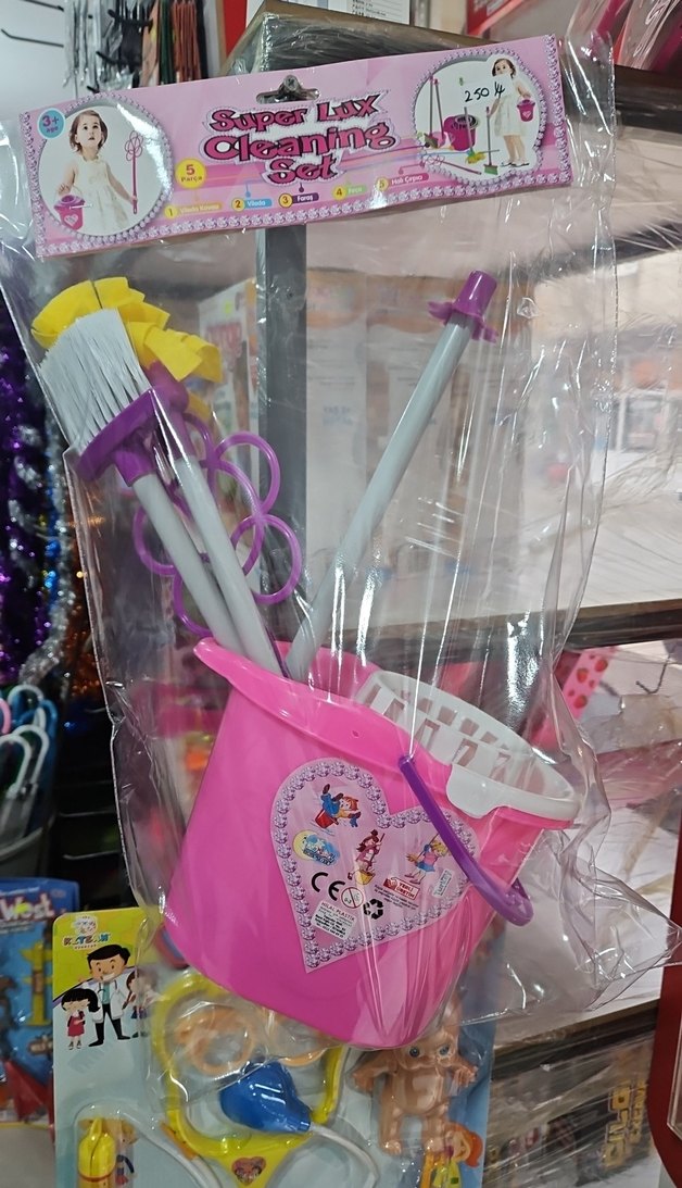 Renkli çocuk temizlik seti, pembe kova ve çeşitli temizlik araçlarından oluşur.