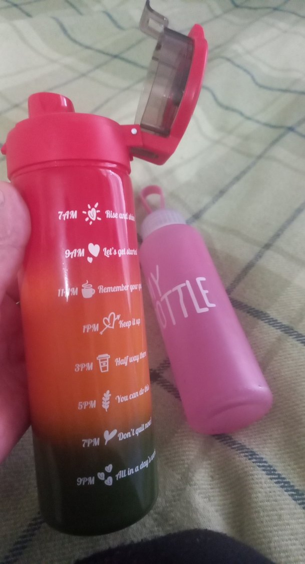 Renkli, zaman işaretli ve motive edici mesajlar içeren çocuk termos matara. Pembe, taşıması kolay ve kapaklı tasarım.