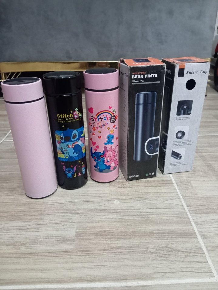 Çocuklar için renkli, pembe termos şişeler. İçindeki içecekleri sıcak veya soğuk tutar. 500 ml