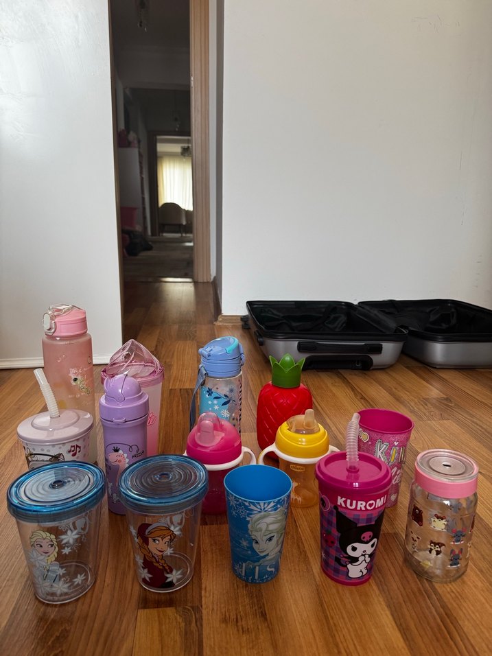 Çeşitli karakter ve meyve figürlü renkli çocuk termos ve suluk seti. Üzerinde "KUROMİ" yazısı bulunmaktadır.