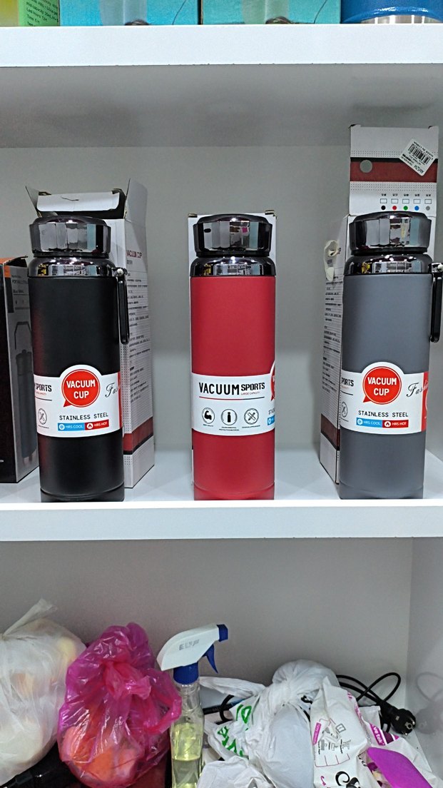 Çocuklar için vakum izolasyonlu, içecekleri sıcak veya soğuk tutan kırmızı renkli paslanmaz çelik termos. Üzerinde 'VACUUM SPORTS' yazısı bulunur.