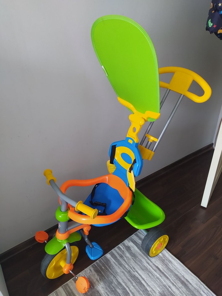 Koruyucu tente, arka tutma kolu ve güvenlik özellikleriyle renkli çocuk üç tekerlekli bisiklet.