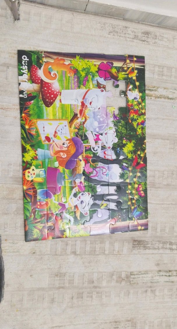 Hayvanlar ve canlı detaylarla dolu renkli bir çocuk yapbozu. 1 parçası eksik onun dışında sorun yok bide 2 taraflı 1 tarafının bu sıkıntısı yok ama ikinci tarafın 3 parçasının resmi kalkmış