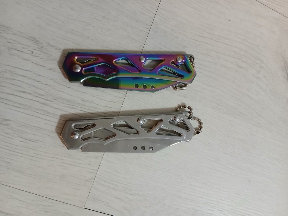 Renkli ve metalik çok amaçlı katlanabilir bıçaklar, geometrik kesim detaylıdır. Anahtarlık aparatı ile taşınabilir.