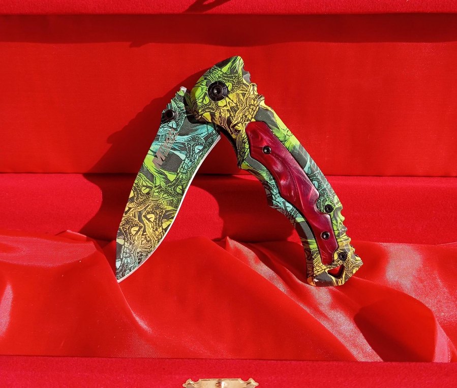 Canlı ve çok renkli desenlere sahip katlanır bıçak, çeşitli kesme işleri için uygundur.