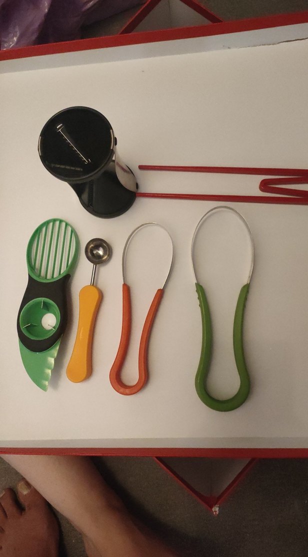 Renkli sapları ve çeşitli mutfak araçları içeren çok amaçlı aksesuar seti.