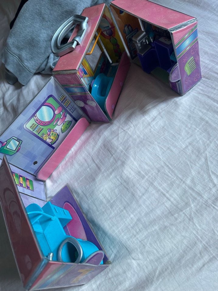Renkli ve çok bölmeli oyuncak ev, ayrıntılı iç tasarımları ve taşıma kulpu ile açılarak farklı odalar ve aksesuarlar sunar.