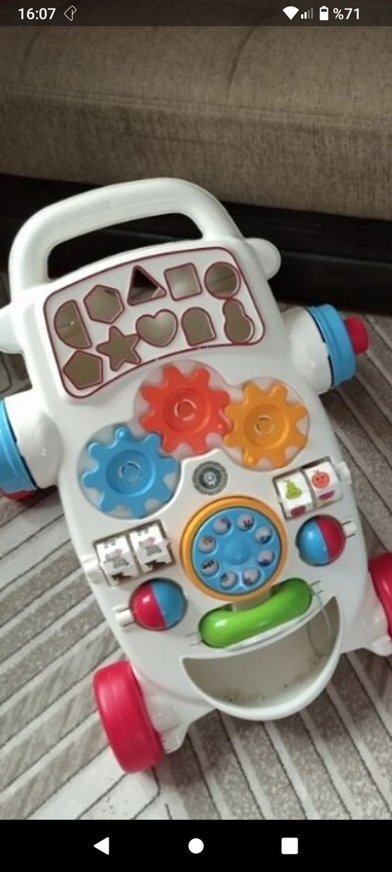 Renkli bebek yürüteci, interaktif dişliler, şekil eşleştirme ve oyuncak telefon tuşları içerir. Sağlam sapı ve tekerlekleriyle kolayca hareket ettirilir.