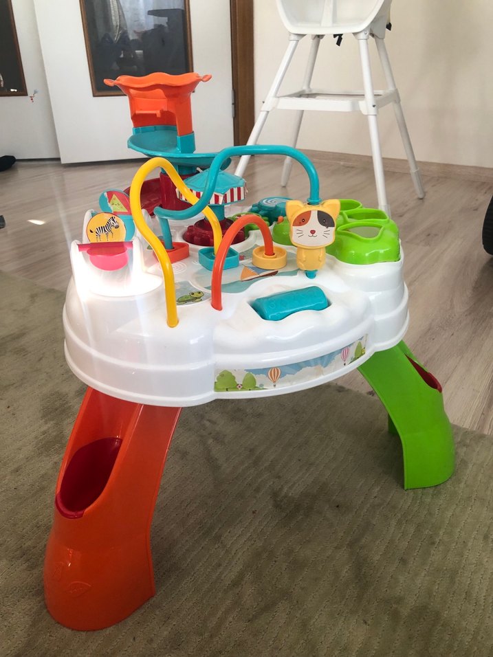 Bu renkli eğitim oyuncağı, boncuk labirentleri ve hayvan figürleri gibi etkileşimli parçalar içerir ve çocukların oyunla öğrenmesini destekler. Müziklidir.Sadece birkaç yerinde kağıtlar çıkmış durumda onlarında fotoğraflarını çektim . Onun dışında bir sorunu yoktur