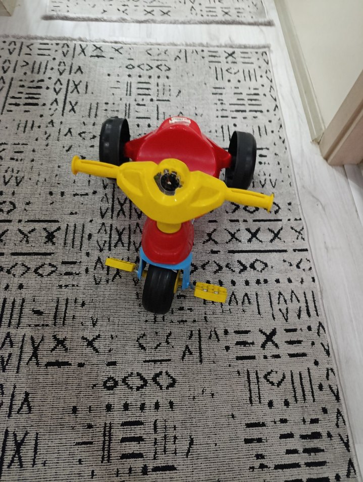 Genç çocuklar için sağlam tekerlekli ve parlak sarı gidonlu renkli üç tekerlekli bisiklet. Çok renkli gövde ile dikkat çekici.