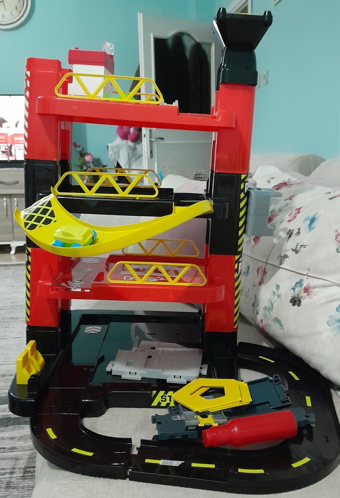 2 parçası eksik Canlı renklerde çok katlı oyuncak araba park yeri, eğlenceli oyun için rampalar ve park alanları içerir. Ana rengi kırmızı, sarı ve siyah detaylıdır.