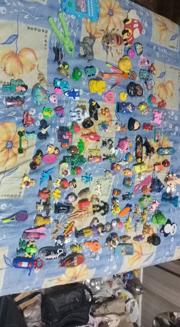 Çeşitli karakter ve tasarımlara sahip renkli aksiyon figürleri koleksiyonu, çiçek desenli bir yüzeyde sergileniyor.