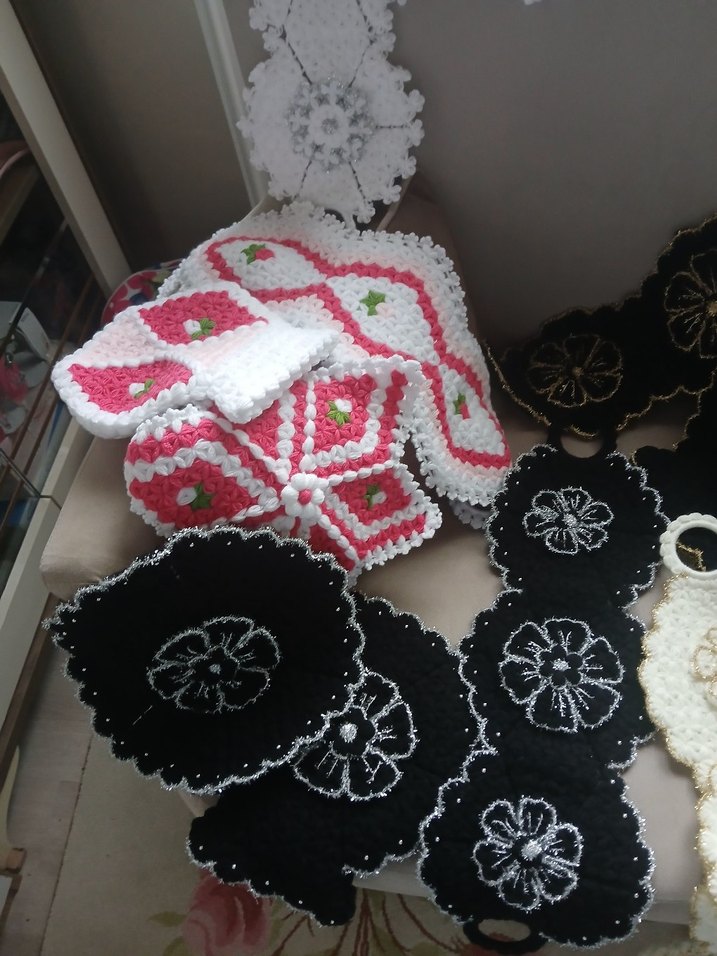 Renkli ve çeşitli tığ işi desenlere sahip çoklu banyo süngeri seti, banyonuza farklı bir dokunuş katar.