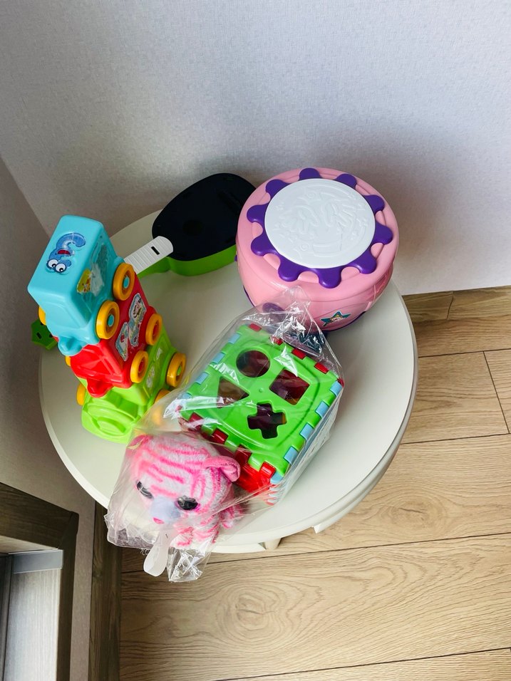 Müzikli davul, aktivite küpü, oyuncak telefon ve peluş ahtapot içeren renkli çocuk oyuncak seti. Eğlenceli oyun için uygundur. Davul çalışmıyor peluş oyuncak kedi ve bul tak sıfır diğerleri kullanılmıştır 1000 TL hepsi