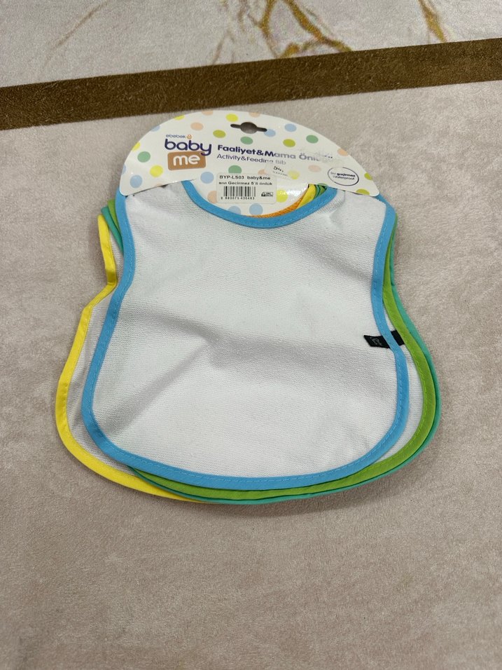 Mavi, yeşil ve sarı kenarlıklı renkli çoklu desenli bebek önlüğü. Yumuşak dokulu ve her gün kullanıma uygun. Paketinde 'me, baby' yazısı bulunur. Görseldekilerin hepsi gönderilecektir (3.ç) #bebek #giyim #ayakkabı #kıyafet