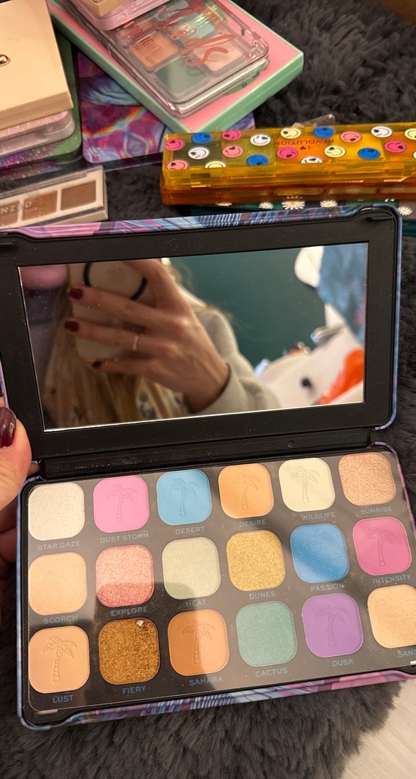 Bu göz farı paleti, pembe, mavi, altın ve nötr tonlarda canlı ve açık renkler sunar, içinde kullanım kolaylığı için ayna bulunur.