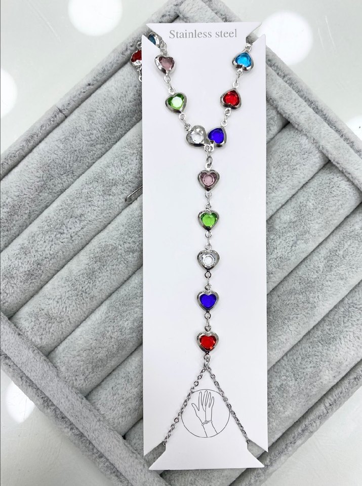 Renkli kalp detayları ve paslanmaz çelikten üretilmiş kadın el zinciri. Nakış desenli, bohem tarzını yansıtan, günlük kullanıma uygun bir aksesuar.