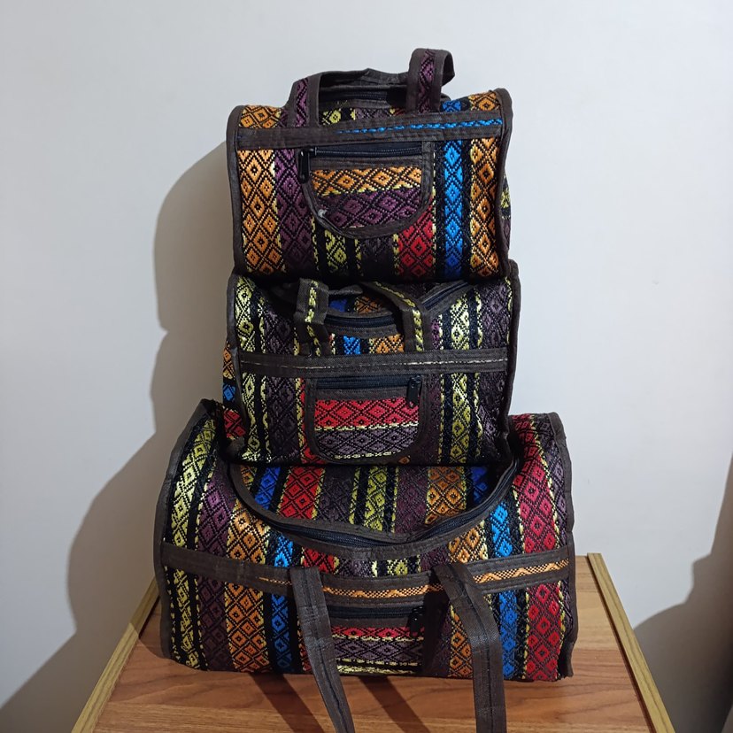 Geometrik desenli, fermuarlı ve saplı üçlü çok renkli düzenleyici seti.