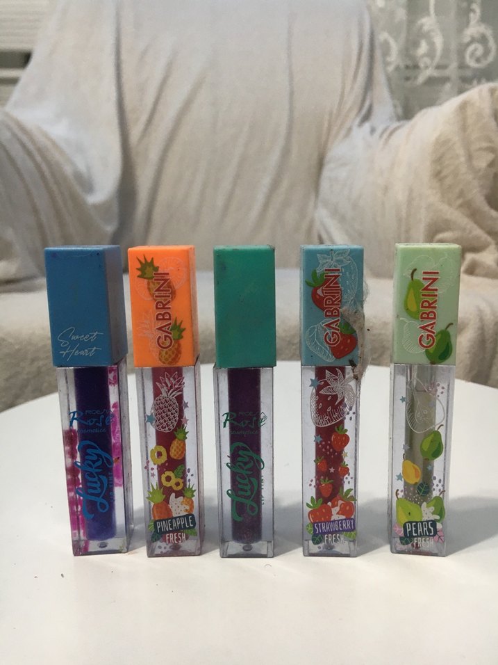 Meyve desenli kapaklarla renkli ve canlı tonlarda lip gloss seti. Toplamda 5 adet az kullanılmış bir sorunları yoktur hepsinin fiyatıdır