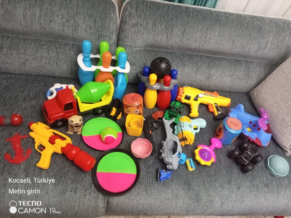 Oyuncak matkap, minyatür bowling topları, oyuncak beton mikseri ve çeşitli renkli oyuncaklardan oluşan set. Hayal gücünü destekler.