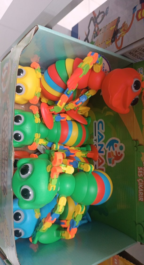 Çok renkli, çok parçalı tırtıl şeklinde eğitici oyuncak, çocukların el becerilerini geliştirmesi için tasarlanmıştır.