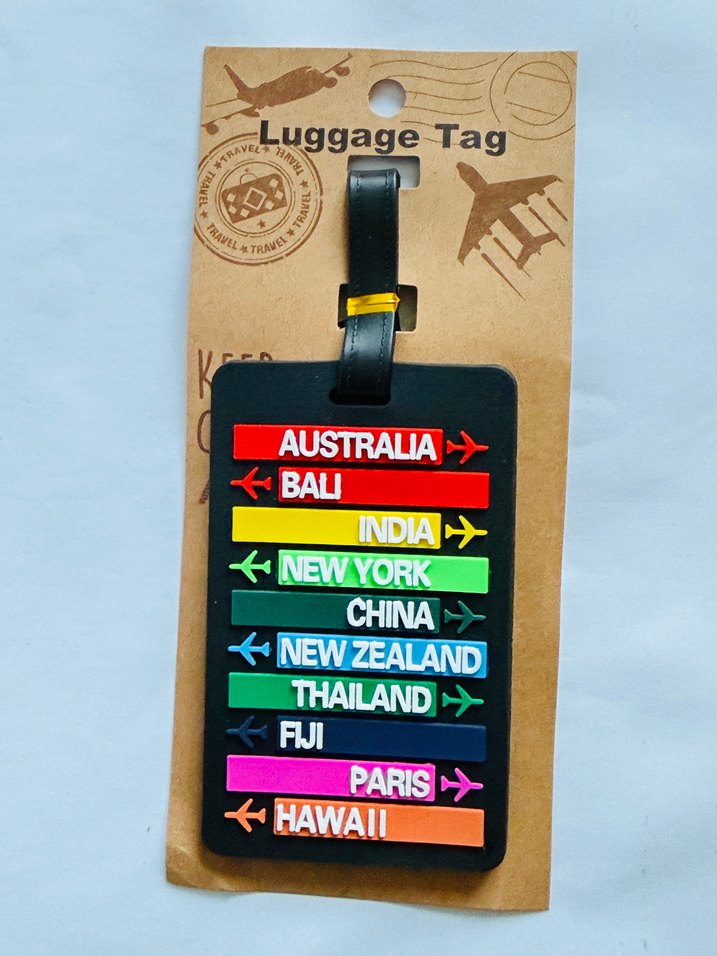 Avustralya, Bali, Hindistan, New York, Çin gibi popüler destinasyon isimleri bulunan renkli bavul etiketi. Bavulunuzu kolayca tanımlamanızı sağlar.