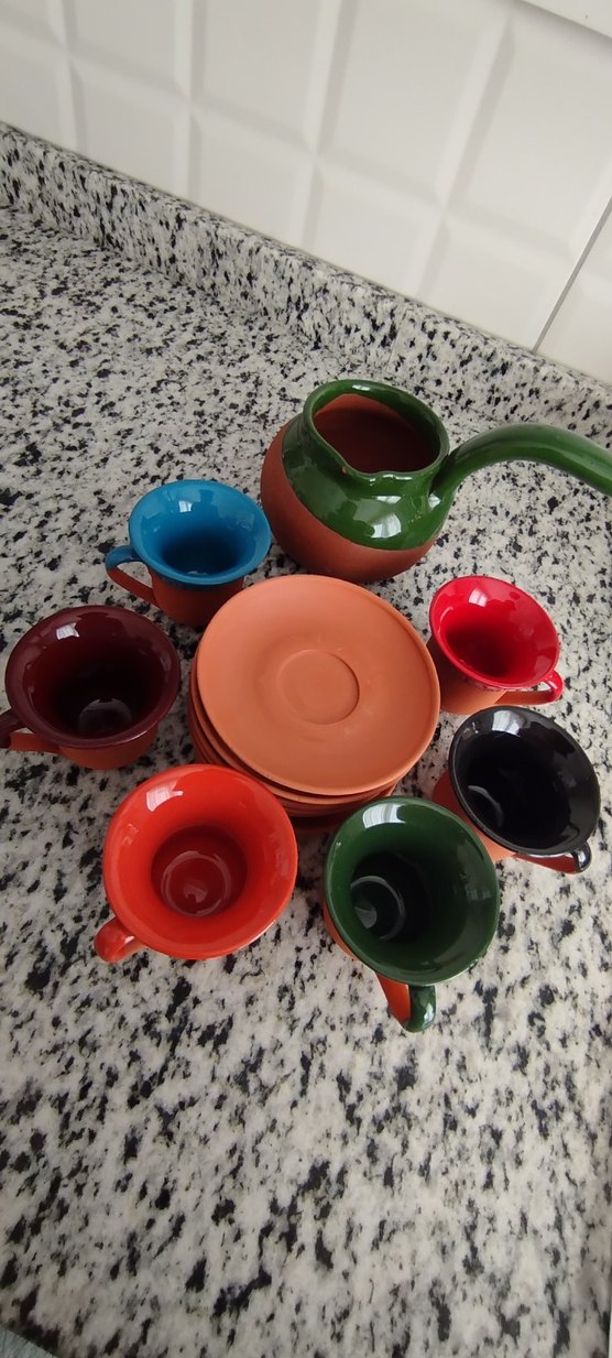 Yeşil cezve ve çeşitli canlı renkte fincanlar içeren renkli 6 Kişilik çömlek fincan seti.