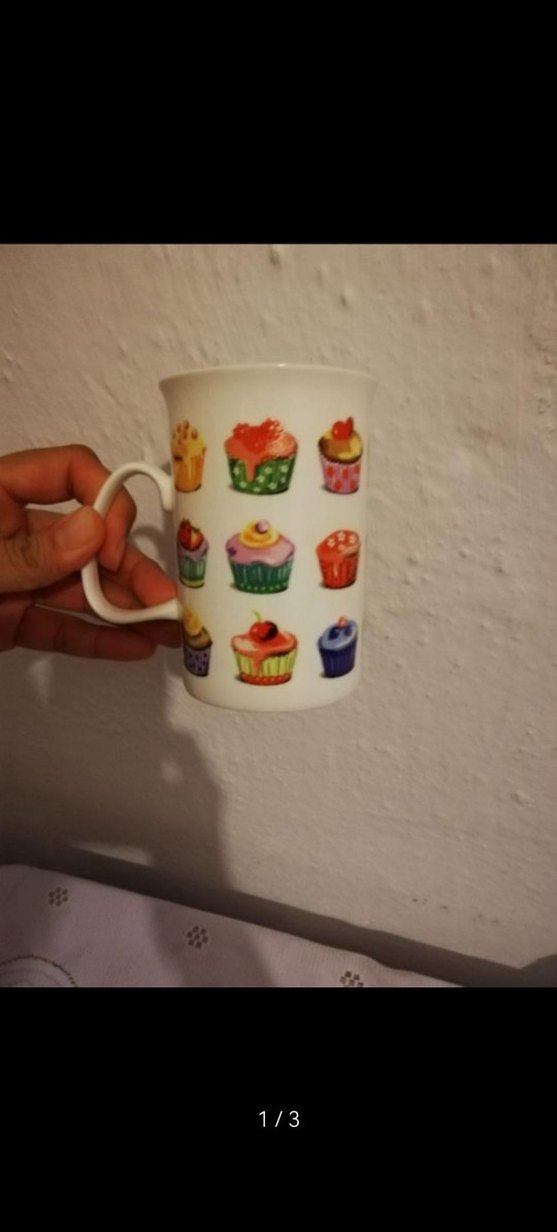 Bu porselen kupa, beyaz zemin üzerinde renkli cupcake desenlerine sahiptir. Sıcak içecekler için uygundur.