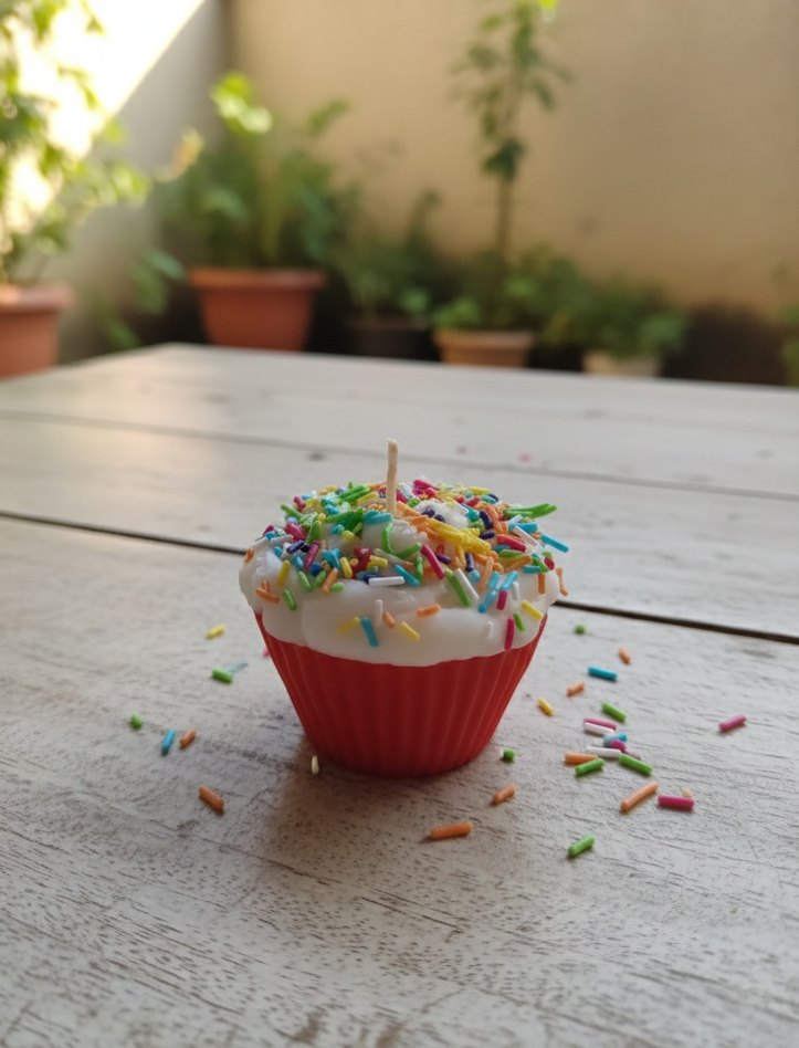 Üzerinde beyaz krem ve renkli serpiştirmeler bulunan cupcake şeklinde renkli mum. ️