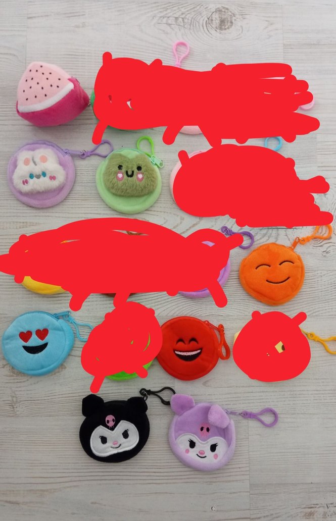 Farklı yüz ifadeleri ve şekillerde, meyve ve hayvan figürlü renkli cüzdan. Her birinde anahtarlık bulunmaktadır.