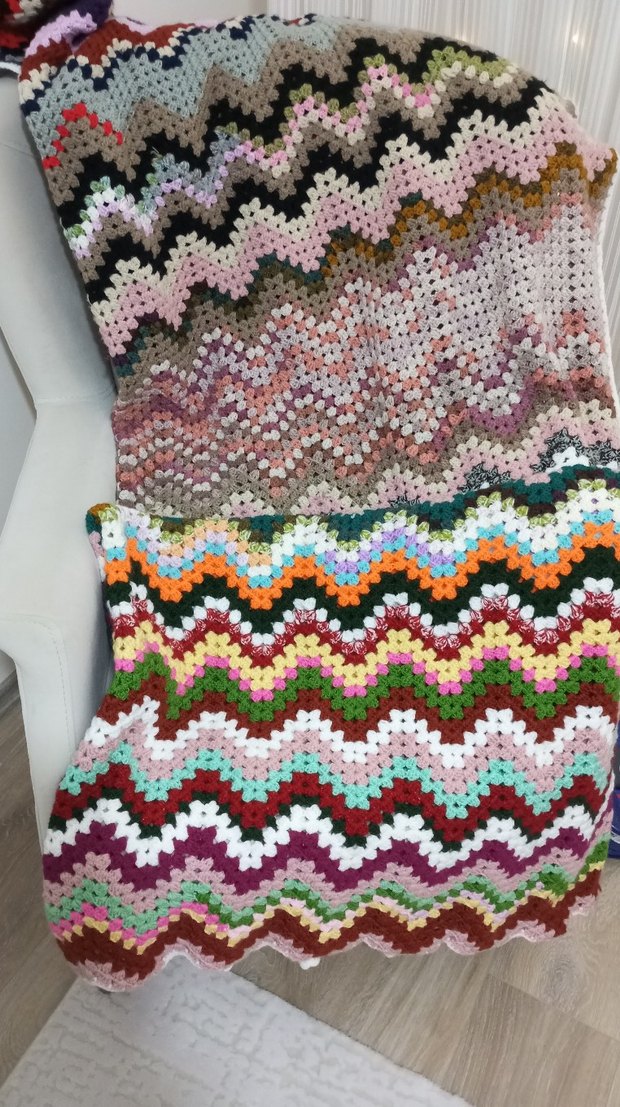 Yumuşak örgü kumaştan yapılmış, dalga desenli renkli battaniye. Çok renkli zikzak deseni bulunur. çeşitli ipler değerlendirildi batik koton akrilik pamuklu vb hiç kullanılmadı.170×210 ebatinda