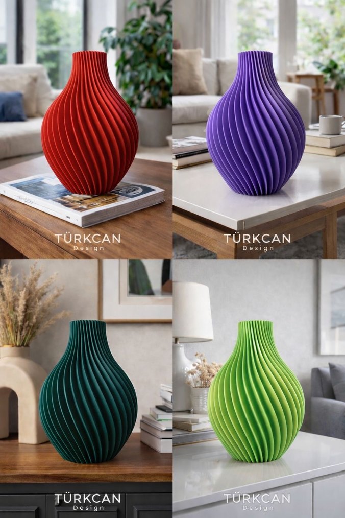 Kırmızı, mor, koyu yeşil ve açık yeşil renklerde, dalgalı tasarıma sahip renkli vazolar. Renkler için iletişime geçiniz.